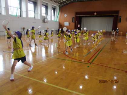 そして体育館で1.2年生そろって踊りました。たまたま校長先生がのぞきに来てくださっていたので,感想を言っていただきました。