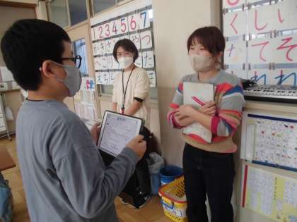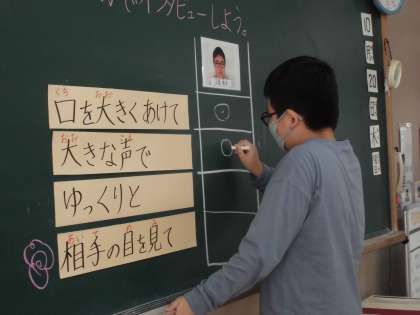 自立活動の「先生たちのことを知ろう」の学習で先生たちの秘密クイズを作るためにいろいろな秘密を聞き出すインタビューを行いました。