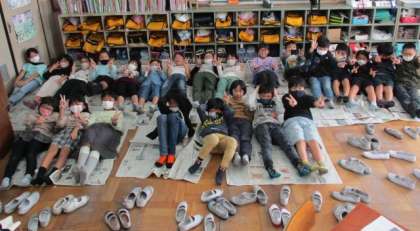 「1平方メートルがどんな大きさか実感しよう」というめあてで新聞紙で1平方メートルを作りました。班で協力し15分間で何枚作ることができるか、がんばりました。全員で15枚つくることができました。1平方メートルに子どもたちは18人乗ることができること、座るなら4人がちょうどいいことがわかりました。そしてみんなでつくった15平方メートルには全員が川の字で寝っ転がれっることもわかって、子どもたちは楽しく1平方メートルと15平方メートルの大きさを実感していました。