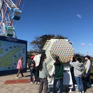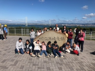 大きな海にそびえ立つ、明石海峡大橋をバックに記念写真を撮りました。