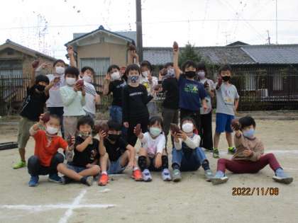 すぐにあちこちから,「あったあ!」「見えてきた!」という声が上がり,近くの子ども同士で協力しながら,掘り上げていました。中には子ども達の顔よりも大きいようなおいもさんもあって,大喜びの子ども達でした。