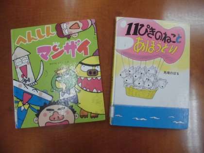 今回の絵本は,「11ぴきのねことあほうどり」と「へんしんマンザイ」です。
