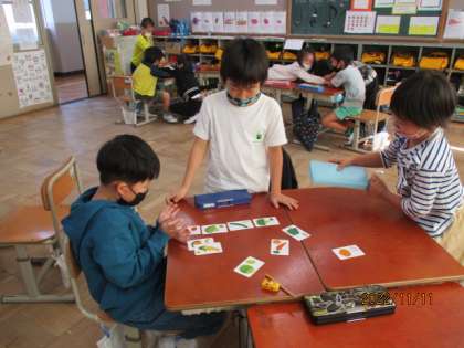 2学期の英語活動がスタートしました。「サラダで元気」をテーマにいろいろな野菜の言い方に親しみ,最後は自分の選んだ野菜でサラダを作って,紹介し合うという活動です。全部で10種類の野菜が登場します。今日は「集中力ゲーム」という,私が読み上げた野菜のカードを正しい順番で選んでいくゲームを号車対抗でやりました。すごい盛り上がりの子ども達でした。