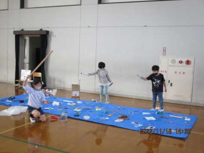 今日もまた体育館で,「おもちゃパーティー」の準備をしました。今日は,実際にお店を開店して,どこにどんなものを並べるのかということを確かめました。