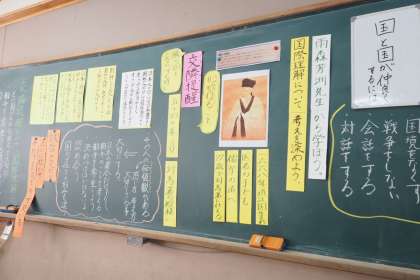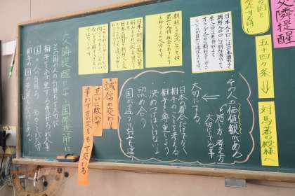 道徳の授業では,社会科で朝鮮通信使について学んだことを生かして,対馬藩と朝鮮の国を繋いだ雨森芳洲について学びました。雨森芳洲が書いた「交隣提醒」には,朝鮮との外交で大切にしたいことが書かれています。国が違うと文化が違う,好みも違う,だからこそそれぞれの価値観を大事にしていきたいという思いを高めていました。
