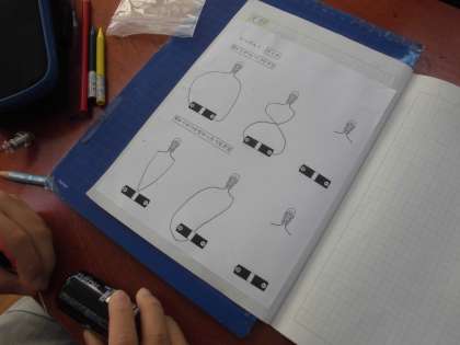 今日は『電気の通り道』の学習で,電球・ソケット付き導線・乾電池をどのようにつなぐと電気がつくのか予想し,実験をしました。