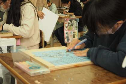日常の自分たちの姿を写真で撮り,絵に描き,版に写して,彫る作業に入っています。