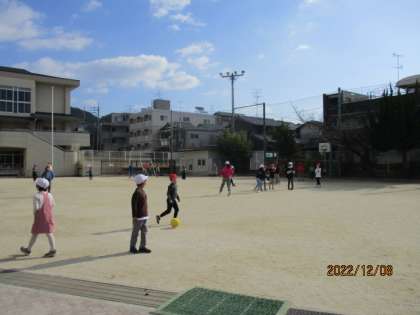 学校に戻ってきてからは、運動場でたてわりグループごとに遊びました。そして、全員が帰ってくると、児童会の人が司会をして、終わりの会をしました。