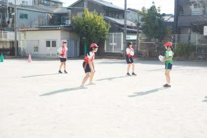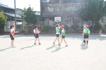 6年生の体育はジョギングが終わり,タグラグビーをしています。