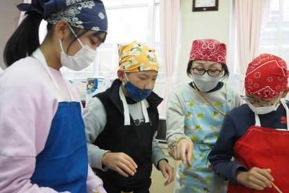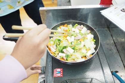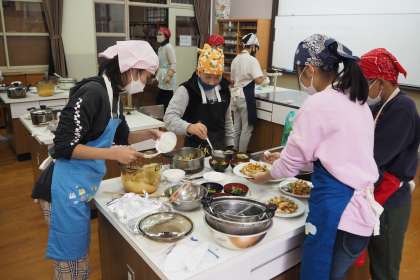 野菜の切り方,味噌の溶き方などいろいろなアドバイスをもらいながら調理実習は進みます。