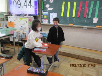 次は「おわらい」の登場です。練習の時にはまず台本から作ってがんばり,「教室の風景」で先生と子どものやりとりを楽しいコントにしてくれました。私も何回も笑ってしまう場面がありました。