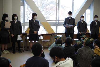 中学校へ着くと,深草中学校の生徒による案内,学校紹介がありました。稲荷小学校出身の生徒会の人たちに子どもたちも安心している様子でした。