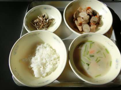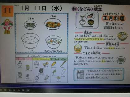 新年あけて初の給食は、「煮しめ」と「ごまめ」と「京風味噌汁」。