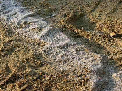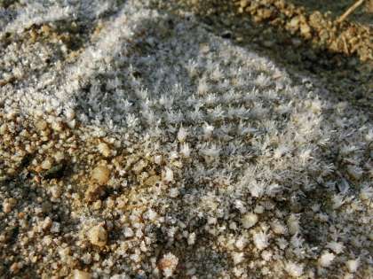 行ってみると、砂場の木のわくや砂の粒に、霜が降りていました。