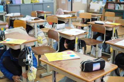 すばやく机の下へもぐり頭や体を守る態勢をとることができました。