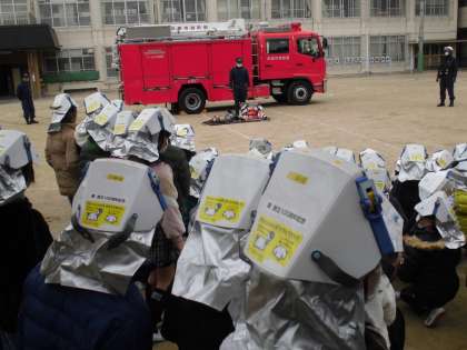 訓練では防災ヘルメットを被り、真剣な表情で避難し伏見消防署の方のお話を聞いていました。