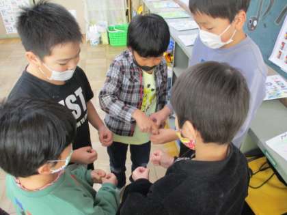 知らなかった子達からもそれを見ると「やってみたい!」という声が上がり,そのあとは3つの輪を作って,のりのりで何回も何回も繰り返して楽しむことができていました。