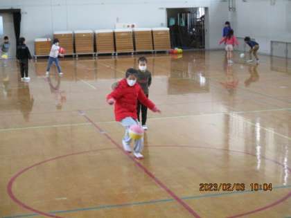 ボールのはずむタイミングと曲に合わせて,脚をまわす動作がなかなかむずかしかった子ども達ですが,だんだんうまくなっていきました。