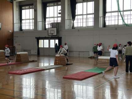 跳ぶ時のポイントを子どもたち同士で確認しながら、安全にも気を付けながら学習しています。
