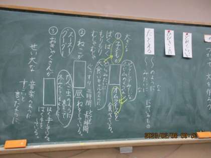 そこで,今日は3つのさしえを見て,それぞれに合う文づくりをしました。同じさしえを見て作っても,色々な文が出来上がるのが楽しいところです。