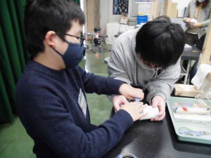 高学年は、実験室学習で「ダンシングカップ」作りに挑戦。先生の話をよく聞いて、真剣なまなざしで取り組んでいました。途中、二人で力を合わせて協力しながらようやく完成!振って机の上に置くと、勝手に動く不思議なカップができあがりました!
