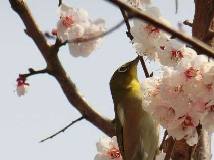 昨日より少し小さいめじろが梅の木にやって来ました。