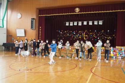 各学年からの心のこもった歌やダンスの発表,そして手作りの稲荷メダルをもらい,