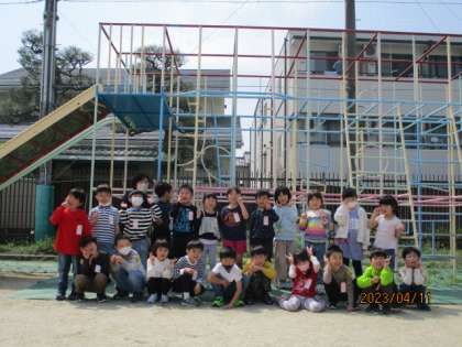 お天気も良かったので,ろ組さんのお友達もいっしょに総合遊具の前で全員写真をとりました。外に出るとみんなとってもうれしそうです!