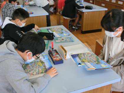 今日は、鳥が空から人の暮らしを見下ろしたような教科書の挿絵から、目に留まったものを友達と交流しました。