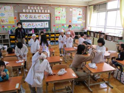 明日からの給食に向けて,今日は給食の用意の仕方や,エプロンを脱いだり,着たりの練習をしました。着脱も練習が必要ですが,エプロンのたたみ方も大事です。
