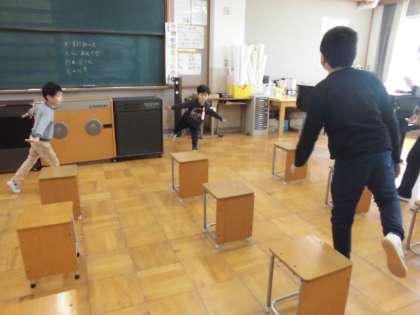 最後は「トンボのメガネ」に合わせて手を広げて飛びまわり、ピアノが止まったら片足でピタッ!!
