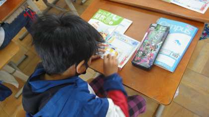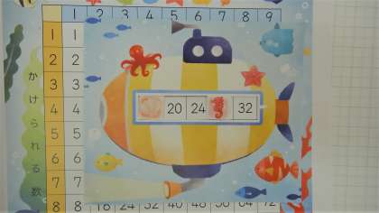 算数「九九の表とかけ算」の学習で、九九の表を使って数字あてクイズをしました。「○ずつふえる」という九九のきまりを使って考えました。ペアで問題を出し合うと、難しい問題を出したい!と2つ隠して問題を出し合うペアもたくさんありました。