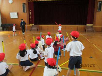 ポールを使ったみんなあそびでは、ポールを立てて離してペアの元に走り、ペアのポールが倒れる前にキャッチをするという少し難しいことをしましたが,ペアのことを考えてポールを上手に立ててあげることを考えたり、色々なことを考えて運動をしていました。,