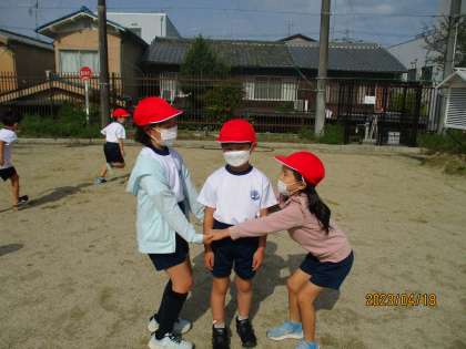 今日は、「レンジでチン」という、おにごっこで体を動かしました。鬼にタッチされた人は凍ってしまいます。でも、写真のように二人が力を合わせて「チーン!」と電子レンジになってとかすことで助かり、また逃げることができます。