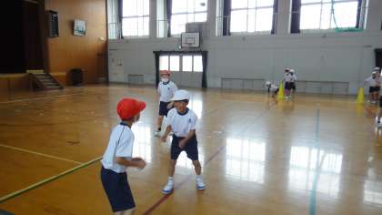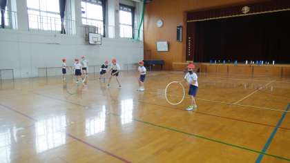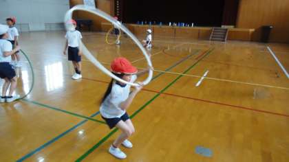 体育「体ほぐしの運動」で、さまざまな運動に取り組んでいます。今日は、ころがしドッジ、外野のないドッジ、フラフープ転がし、フラフープなわとび、どんじゃんけんなどをしました。体を動かすことが好きな子が多いようで、いきいきとした表情で楽しんでいました。