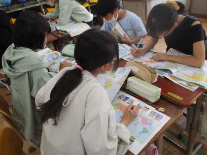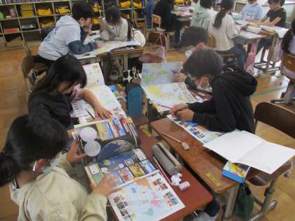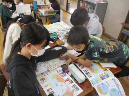 友だちと地図帳や資料集を活用しながら、国名や国旗を調べました。