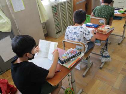 国語で国語じてんの使い方を学習しました。あいうえお順に載っていること、「ホール→ボール→ポール」のように、「清音→濁音→半濁音」の順に載っていること、「シール・カード・プール」のようなのばす音がある場合、「しいる・かあど・ぷうる」のように「あ・い・う・え・お」に置き換えられて、並んでいることなど、たくさんのルールを知りました。