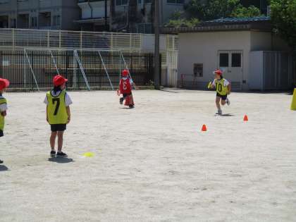 今日のリレーあそびは、お天気がよかったので運動場でできました。