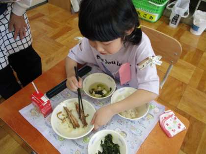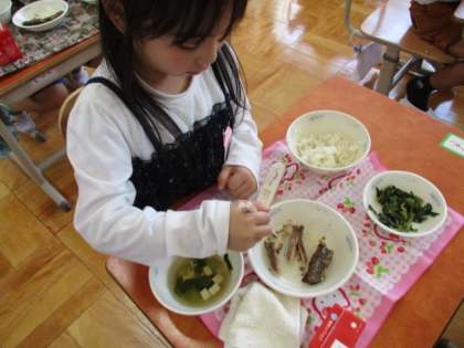 「お魚シリーズ」も今日で3日目。「さんま」が登場しました。火曜日に教えてもらったことをもう一度確かめてから,さあ本番。みんな一生懸命にお箸を使ってがんばっていました。