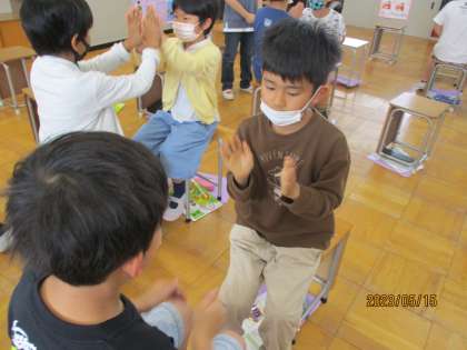 音楽で「茶つみ」という歌を歌っています。今日は、その歌に手遊びもつけて歌ってみました。両手を合わせるタイミングが少し難しそうでしたが、2人ペアでリズムに合わせて楽しみました。