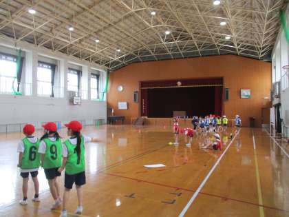 今日の体育は、1時間目に雨が降ってしまい、グラウンドが水びたしになってしまったので、体育館で行いました.