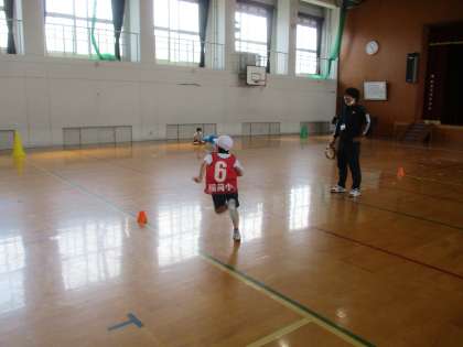 準備運動で反復横跳びもし、走る準備はオッケー!グループで走順を決め、向こうにあるコーンをぐるりとまわって帰ってきます。リレーあそびも4回目なので慣れてきたこともあり、コーンのまわり方も上手です。バトンタッチでもたもたしてしまっているチームがあったので、最後の2回はバトンタッチもスムーズにいけるといいなと思います。