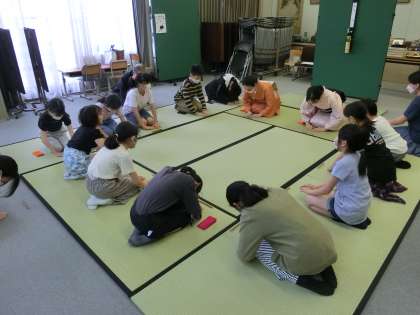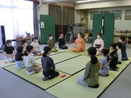 ふれあいホールに素敵な茶室が設えられ、かしこまった子どもたちがお茶のお稽古を始めました。