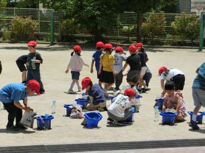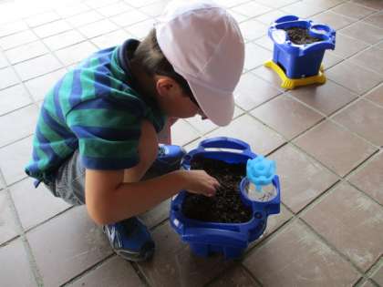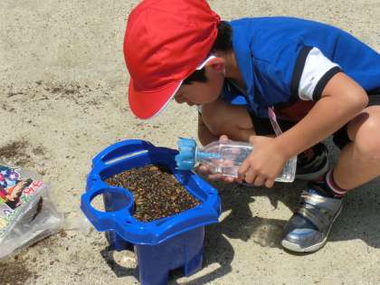 土を入れたり,肥料をまぜたり,お水をまいたりして,これで,たねまきの準備完了!