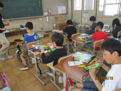 理科「風とゴムのはたらき」の学習で、車を組み立てて、ゴールを目指して車を走らせました。