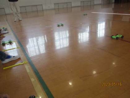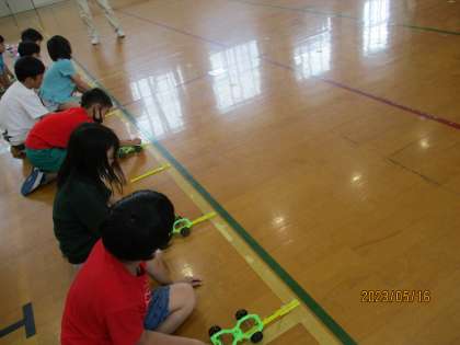 「ちょっと強すぎたから、次は〇センチにしてみよう。」と、ゴールの線ぴったりで止めるにはゴムを何センチ伸ばしたらよいか考えながら楽しみました。