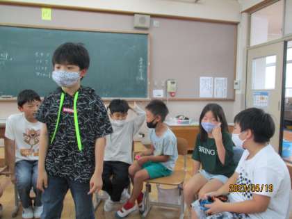 今日は、あいにくの雨だったので、中間休みのみんなあそびは教室で「フルーツバスケット」をしました。みんなで一つの輪になって「イチゴ・ブドウ・バナナ・マスカット」に分かれて楽しみました。「フルーツバスケット!」と言われると全員で一斉に動くので、押されてけがをしないか少し心配でしたが、けがなくみんなで楽しむことができました。