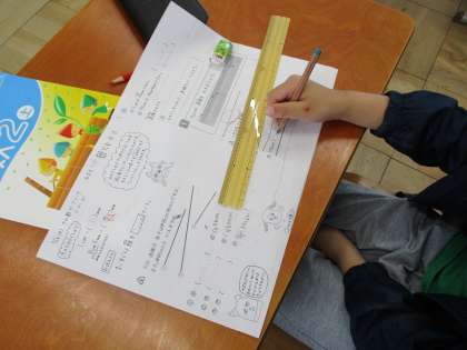 長さを読む問題では、何センチメートルは得意なみんなですが、何ミリメートルが出てくると「先生・・・目がしばしばしてきました。」「チカチカしてよく読めません・・・」と訴え始め、大苦戦!