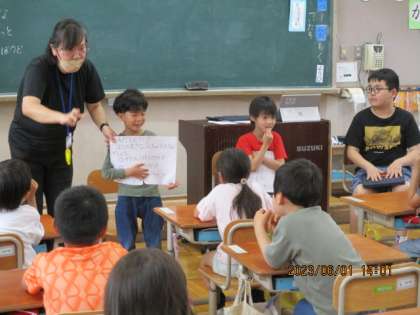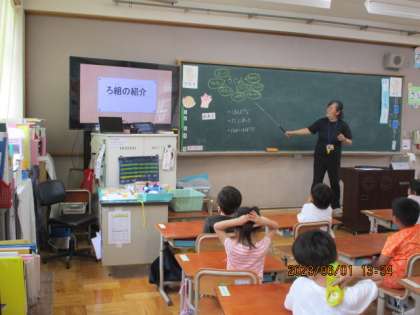 前半は,担任の先生から,ろ組さんの学級の様子やそれぞれの子ども達の紹介を聞かせてもらいました。そして,後半はろ組の子ども達が教室に来てくれて,順番にクイズを出してくれて,みんなで盛り上がっていました。