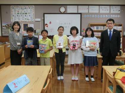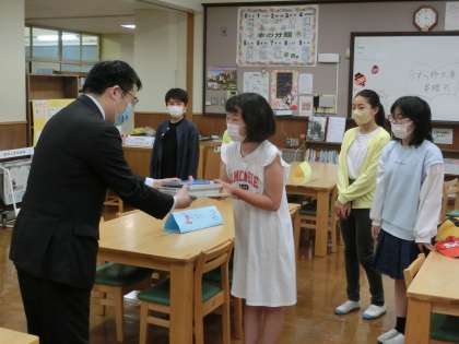 今日は、全校の児童を代表して、委員会の人が図書館で贈呈を受け、感謝の言葉を伝えました。